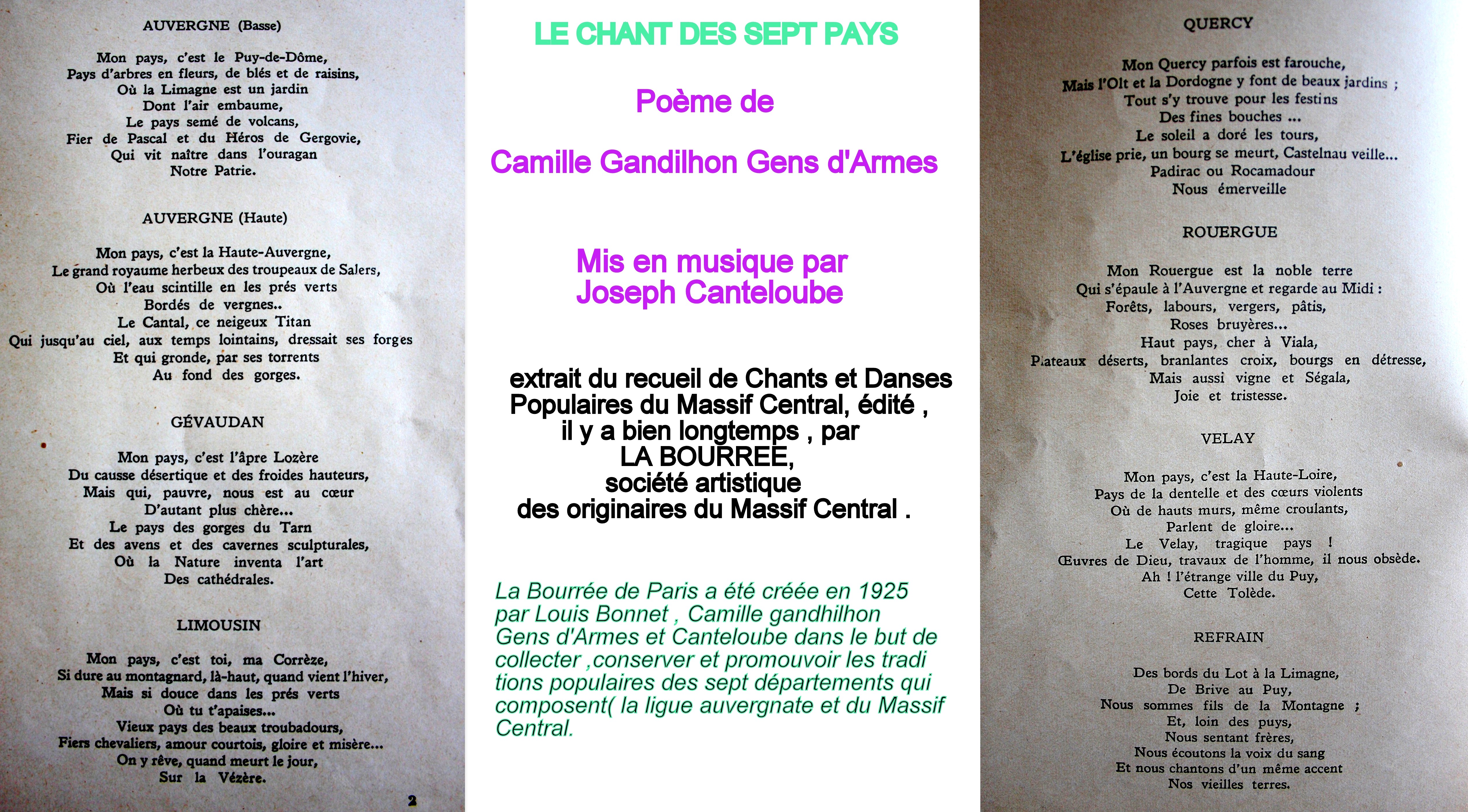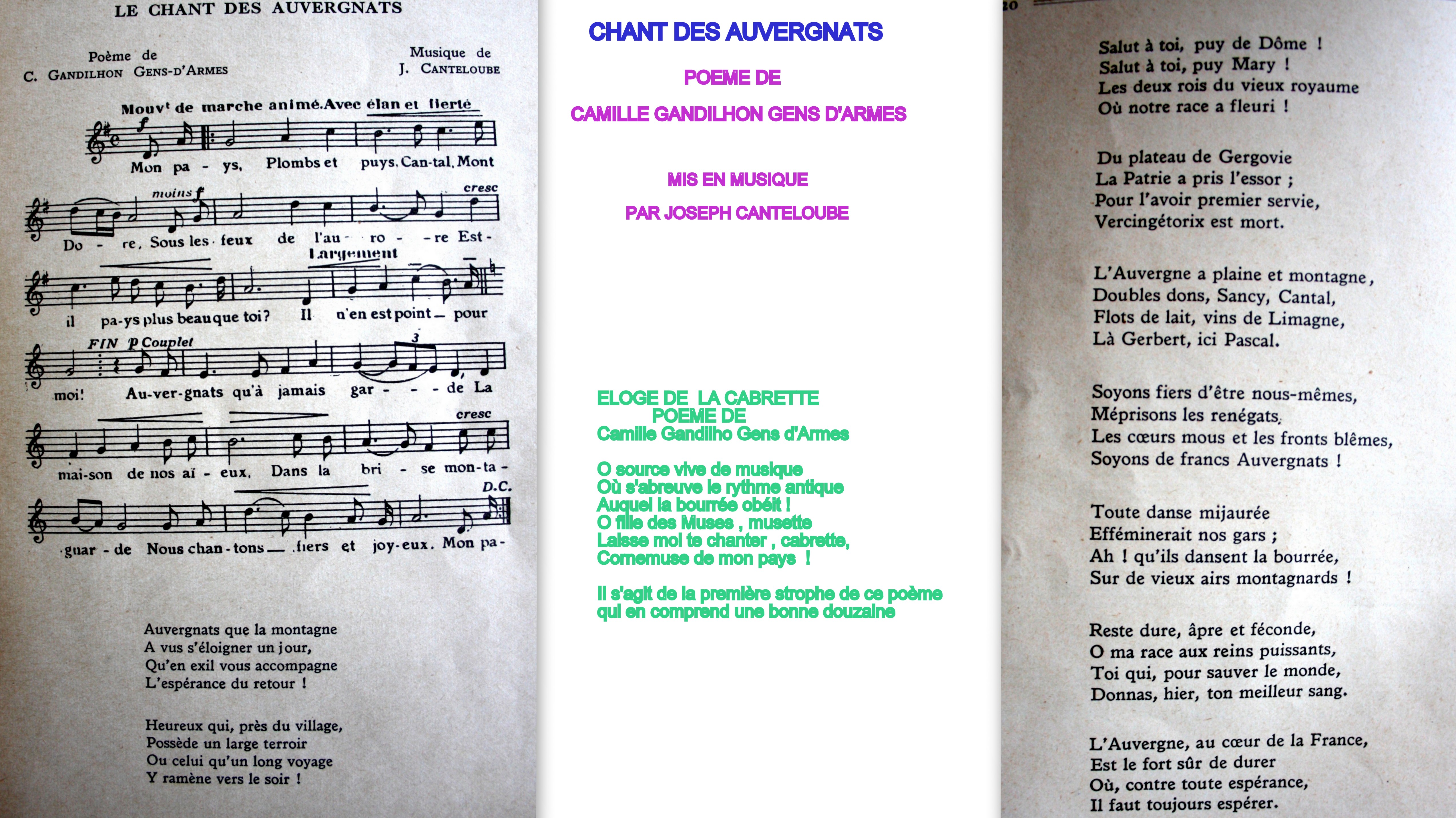 Extraits des poèmes Arvernes , le Chant des Auvergnats et le Chant des sept pays (les sept départements membres de la ligue auvergnate et du massif central ) composés par Camille Gandilhon Gens d’Armes et mis en musique par Joseph Canteloube .