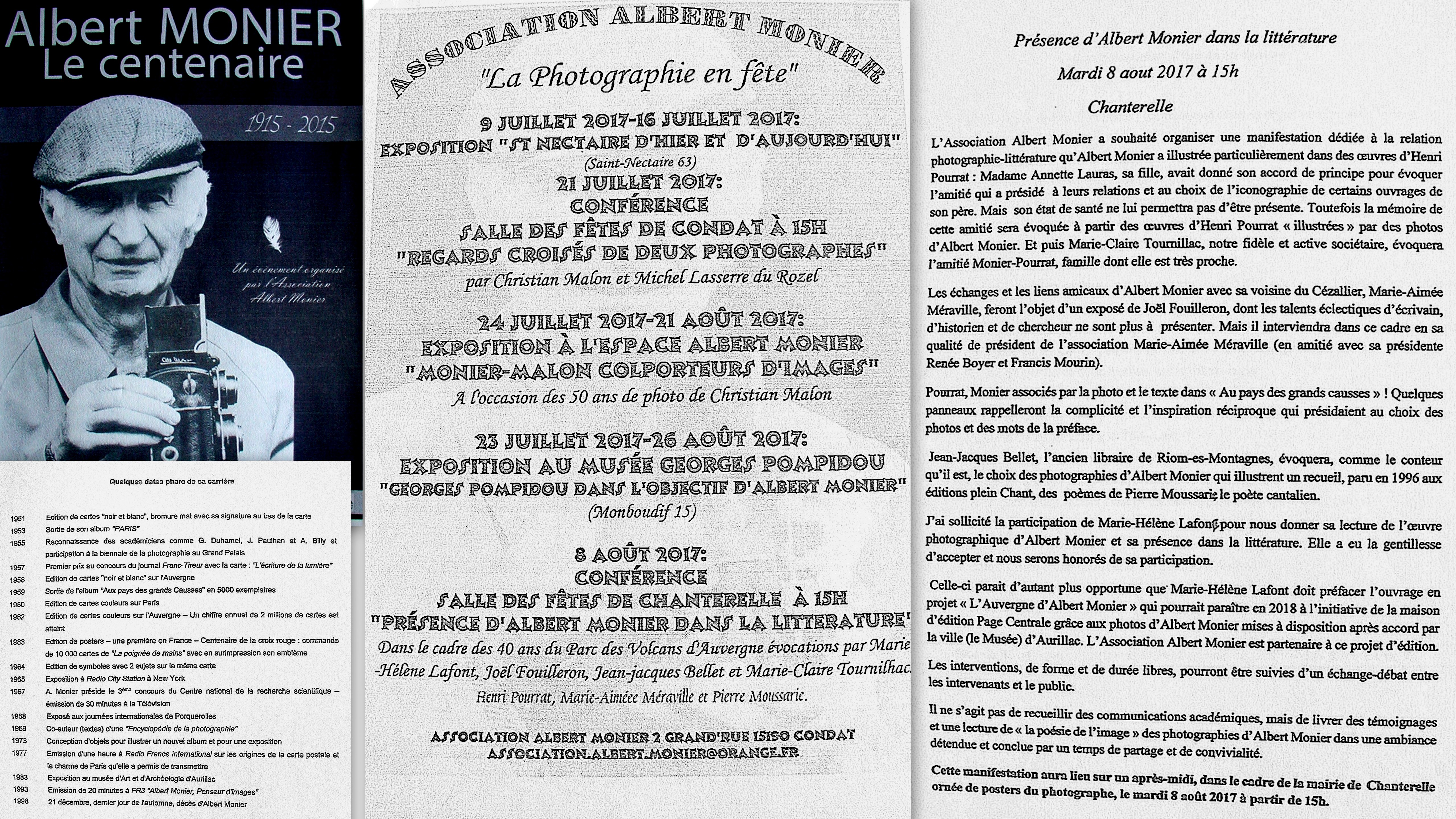 Le mardi 8 août 2017 à Chanterelle , commune natale d’Albert MONIER , passionnante conférence » Présence d’Albert Monier dans la littérature » organisée par l’association Albert Monier. Devant une centaine de personnes plusieurs intervenants de grande qualité ont évoqué la relation photographie-littérature illustrée par ce grand photographe humaniste dans diverses œuvres et les liens d’amitié qui l’unissaient à Henri Pourrat , Marie-Aimée Méraville et Pierre Moussarie.